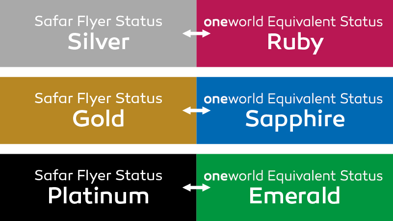 Ao voar na Royal Air Maroc ou em qualquer companhia aérea membro da Aliança, poderá alcançar o status de cartão Safar Flyer, que agora é reconhecido por todas as companhias aéreas membros da oneworld, de acordo com a equivalência mostrada.