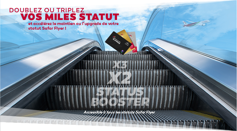 Votre abonnement trimestriel au Status Booster x2 ou x3 vous permet d’accélérer le maintien de votre statut Safar Flyer actuel ou l’accès au statut supérieur.